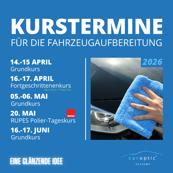 Die caroptic academy startet mit vollem Elan ins Jahr 2026! Die Termine für Februar und März sind schon ausgebucht. Es gilt keine Zeit zu verlieren, deswegen sicher dir schnell deinen Platz im nächsten Kurs und werde zum Aufbereitungs-Profi!